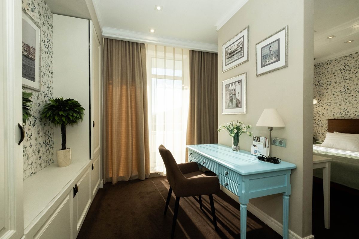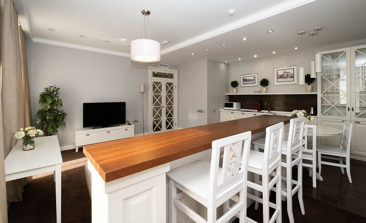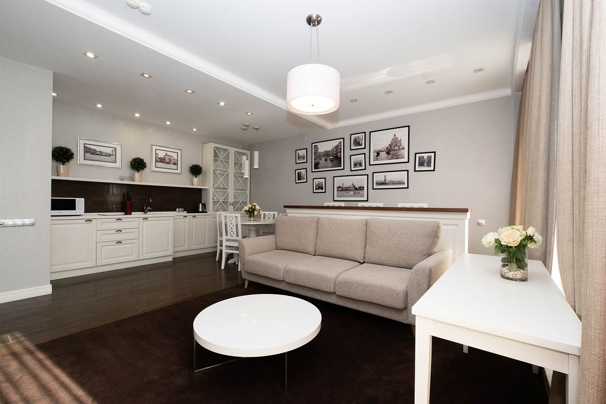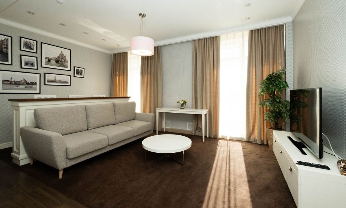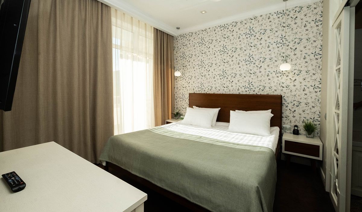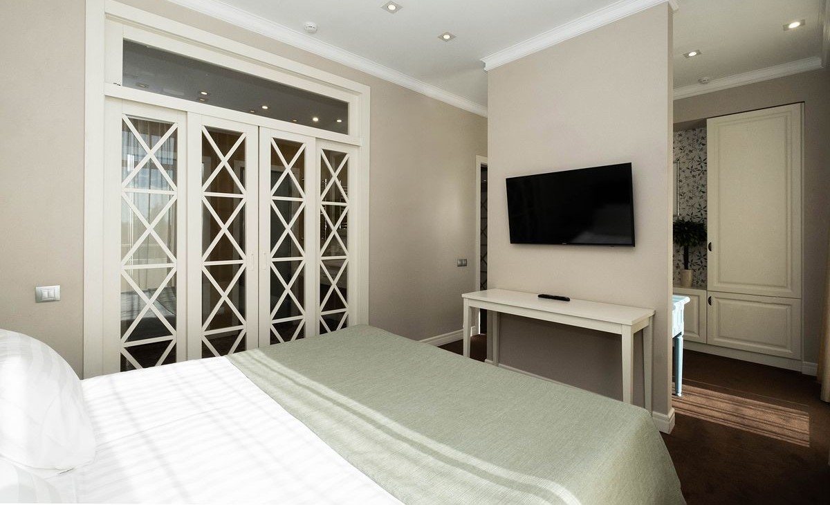 Площадь номера - 74 кв.м. 1 осн. место. 4 доп. места. Балкон. Мебель: вешалка, диван, зеркало, кровать двуспальная, кухонная мебель, прикроватные тумбочки, стол, столик журнальный, стулья, шкаф. Мини-кухня. Оборудование: гладильная доска, кондиционер, микроволновая печь, набор посуды, сейф, телевизор, телефон, утюг, холодильник, электрочайник. Санузел: биде, с ванной, с душем, тапочки, туалетные принадлежности, фен, халат. Сервис: Wi-Fi бесплатно, смена полотенец, смена постельного белья, уборка номера.