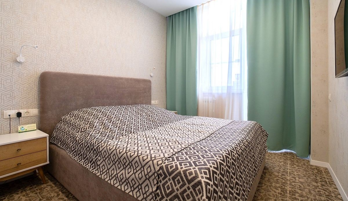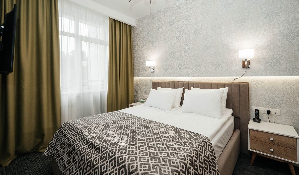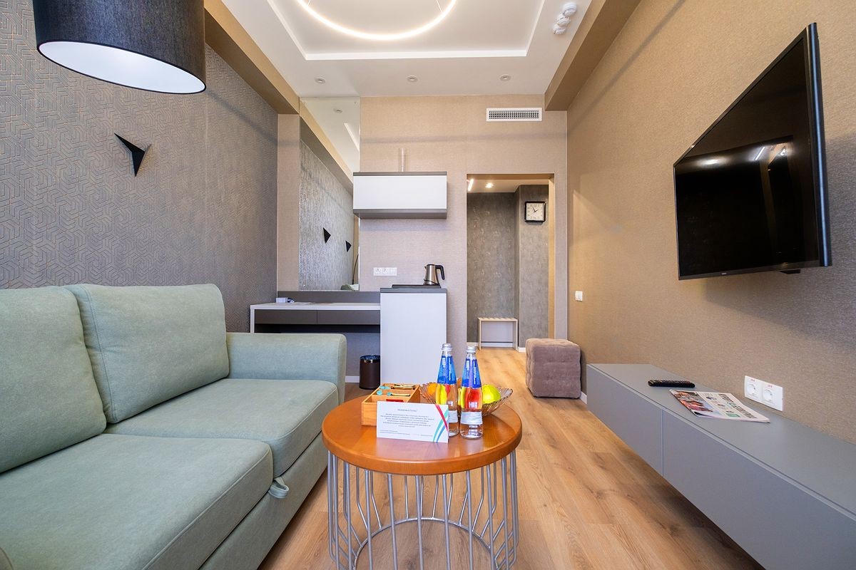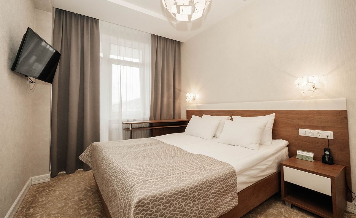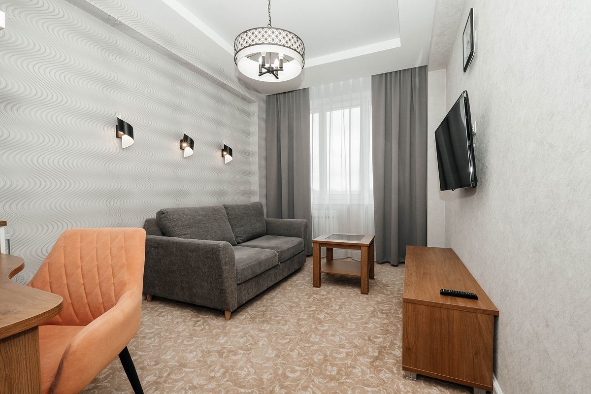 Площадь номера - 37 кв.м. 2 осн. места. 2 доп. места. Балкон. Мебель: вешалка, диван, зеркало, кровать двуспальная, набор мягкой мебели, прикроватные тумбочки, стол, столик журнальный, столик туалетный, стулья, шкаф. Оборудование: гладильная доска, кондиционер, микроволновая печь, набор посуды, сейф, стиральная машина, телевизор, телефон, утюг, холодильник, электрочайник. Санузел: биде, с ванной, тапочки, туалетные принадлежности, фен, халат. Сервис: Wi-Fi бесплатно, смена полотенец, смена постельного белья, уборка номера.