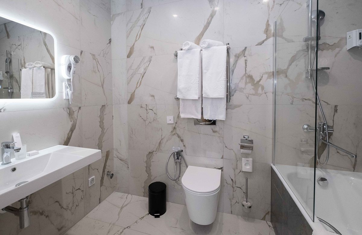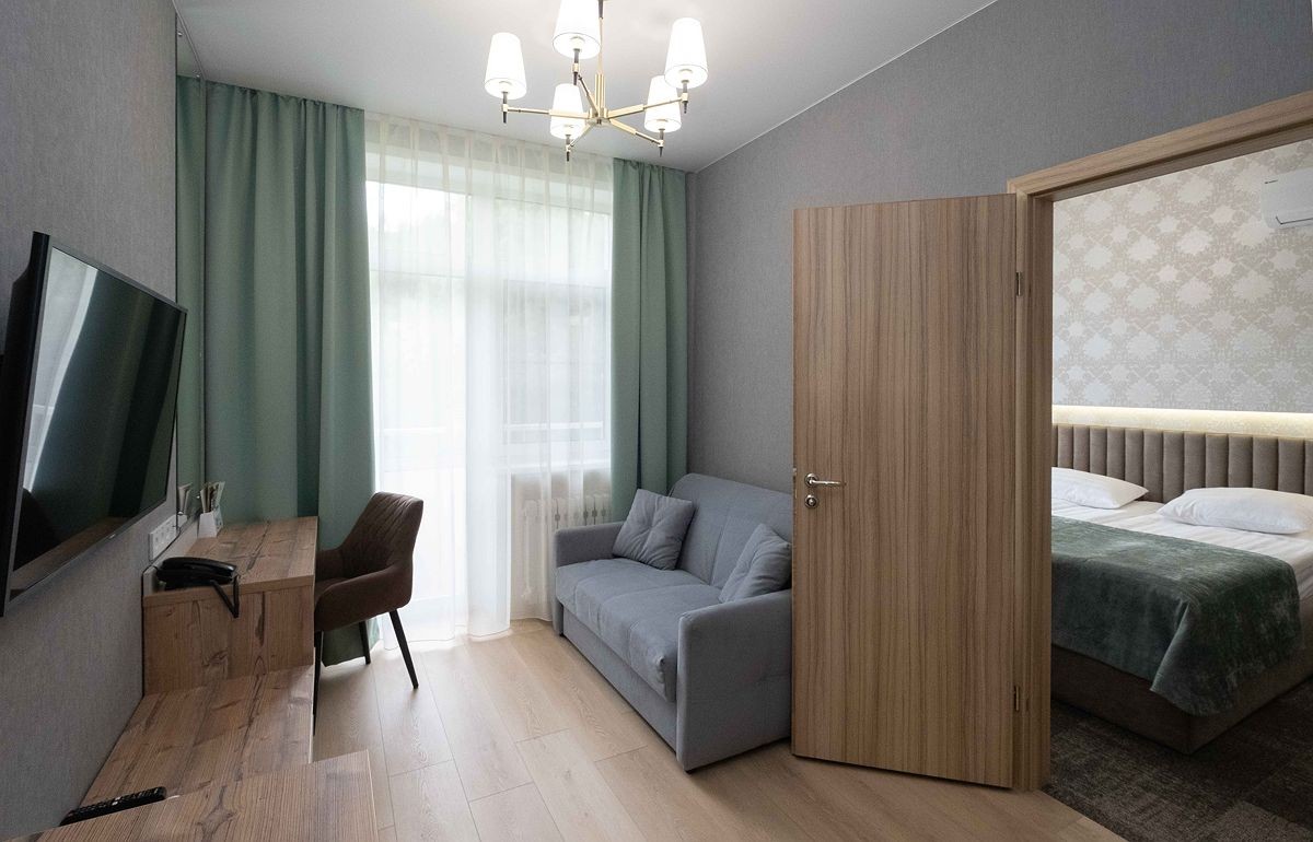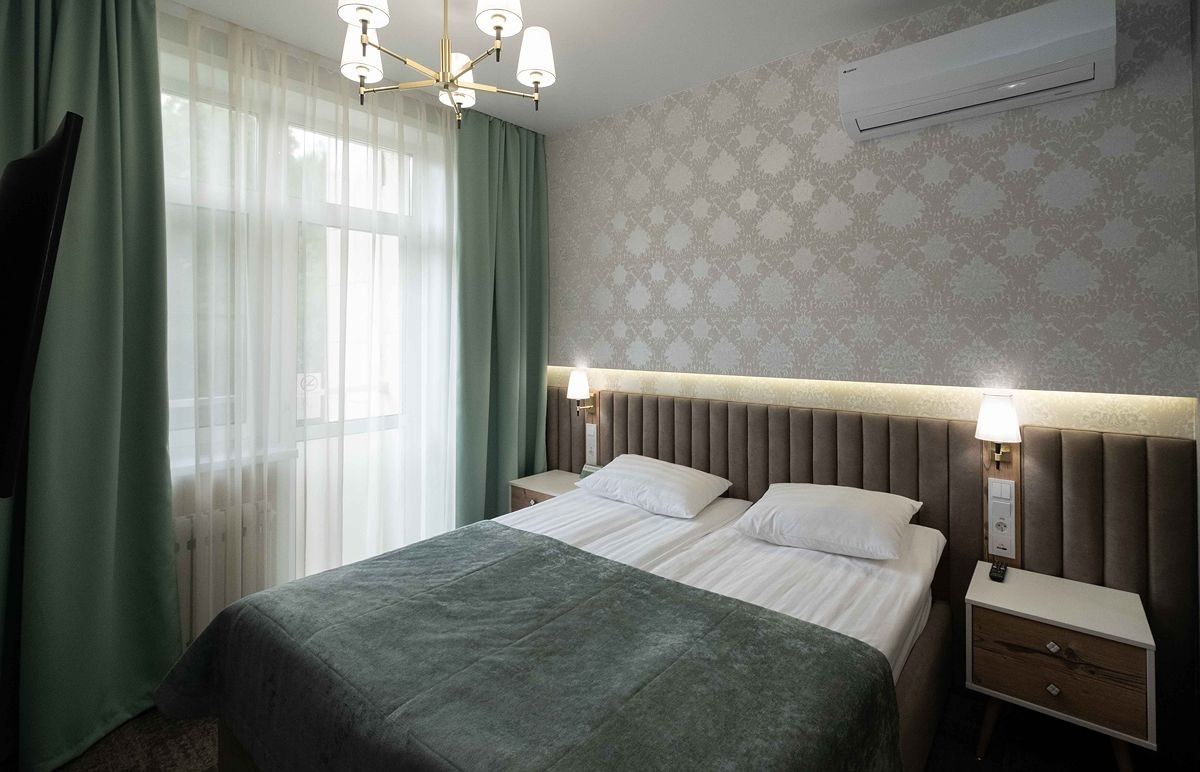 Площадь номера - 27 кв.м. 2 осн. места. 1 доп. место. Балкон. Мебель: вешалка, диван, зеркало, кресло-кровать, кровать двуспальная, прикроватные тумбочки, стол, стулья, шкаф. Оборудование: кондиционер, набор посуды, телевизор, телефон, холодильник, электрочайник. Санузел: биде, с ванной, тапочки, туалетные принадлежности, фен, халат. Сервис: Wi-Fi бесплатно, смена полотенец, смена постельного белья, уборка номера.