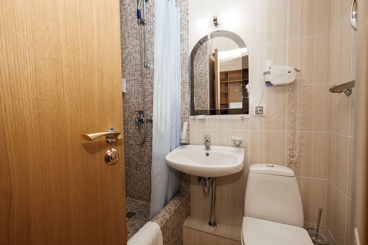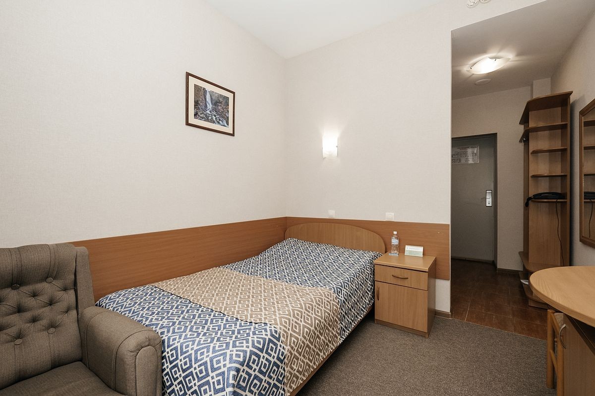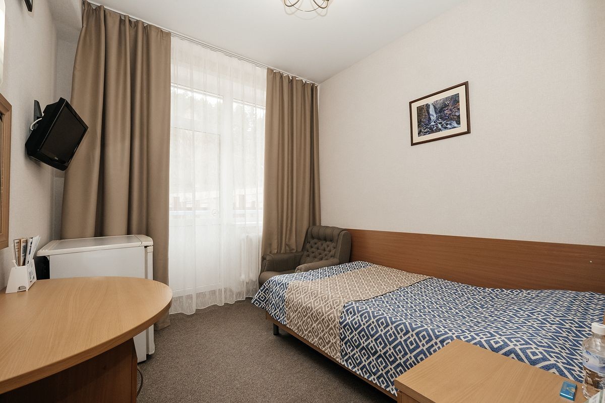 Площадь номера - 15 кв.м. 1 осн. место. 1 доп. место. Балкон. Мебель: вешалка, зеркало, кровать полутороспальная, прикроватная тумбочка, стол, стул, шкаф. Оборудование: набор посуды, телевизор, телефон, холодильник, электрочайник. Санузел: с душевой кабиной, тапочки, туалетные принадлежности, фен, халат. Сервис: Wi-Fi бесплатно, смена полотенец, смена постельного белья, уборка номера.