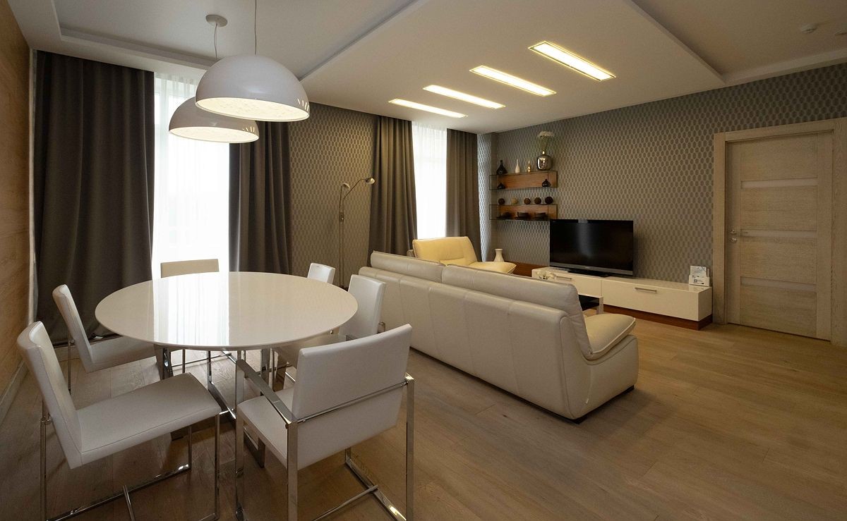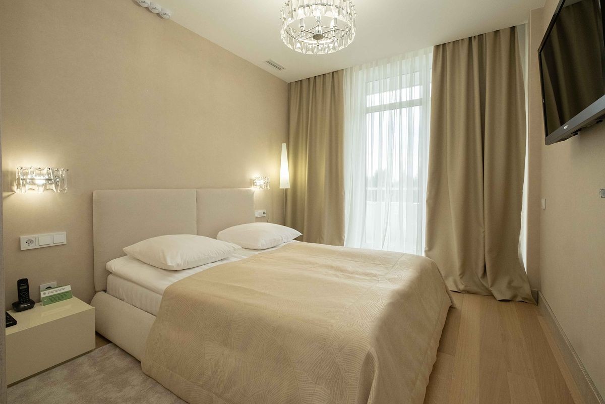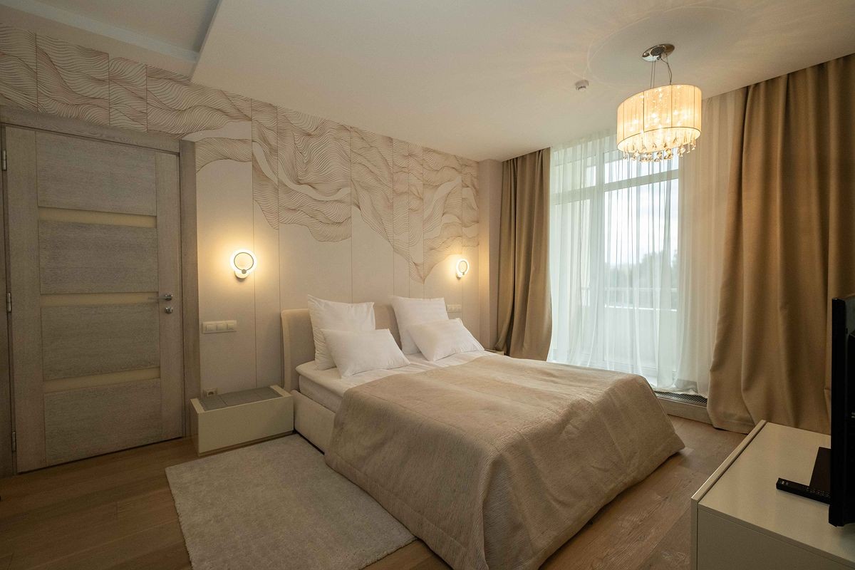 Площадь номера - 100 кв.м. 2 осн. места. 4 доп. места. Балкон. Мебель: вешалка, диван раскладной, зеркало, кровать двуспальная (2 шт.), набор мягкой мебели, прикроватные тумбочки, стол, столик журнальный, столик туалетный, стулья, шкаф. Мини-кухня. Оборудование: гладильная доска, кондиционер, микроволновая печь, набор посуды, плита электрическая, сейф, стиральная машина, телевизор, телефон, утюг, холодильник, электрочайник. Санузел: 3 санузла, биде, сауна, с джакузи, с душевой кабиной, тапочки, туалетные принадлежности, фен, халат. Сервис: Wi-Fi бесплатно, смена полотенец, смена постельного белья, уборка номера.